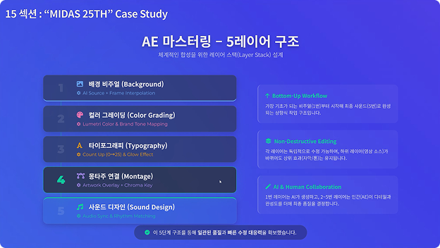 5가지 실무 Case-Study를 통해 영상 기획과 구조에 대한 이해는 물론 단계별 프레임 설계, 실무자들이 실제로 사용하는 AI 활용법을 학습합니다.